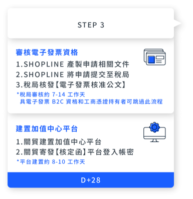 只要有公司設立登記與稅籍登記,就能向財政部申請電子發票,但從申請工商憑證與電子發票資格,常見作業流程便可長達 40 天,還不包含串接系統等費心費時的準備項目。想省時省力、即刻開店,就靠 SHOPLINE!
